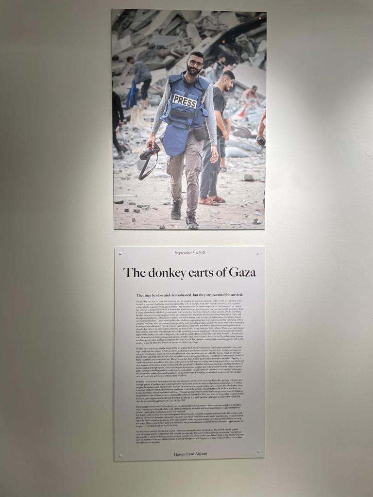 The writing featured in the exhibition conveys their mission according to the WANN website, “We Are Not Numbers (WANN) is a youth-led Palestinian nonprofit project in the Gaza Strip. It tells the stories behind the numbers of Palestinians in the news and advocates for their human rights.” Each story is like entering a conversation with a WANN writer, as they tell you about the details of their daily lives, touched by injustice, in a situation that they never chose.