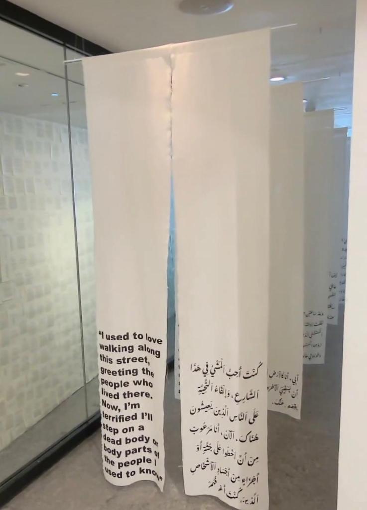 The use of several different mediums immersed with writing such as essays, poems and shrouds with quotes from writers, showed many ways that words can illuminate the experiences of Palestinians who are often separated by English-speaking populations by barriers such as language, culture, and news channels which have been found to be ill-equipped to represent their truth. Walking through white shroud-like curtains covered with quotes offered a multi-sensory experience into being in an unexpected state, enclosed from the world.